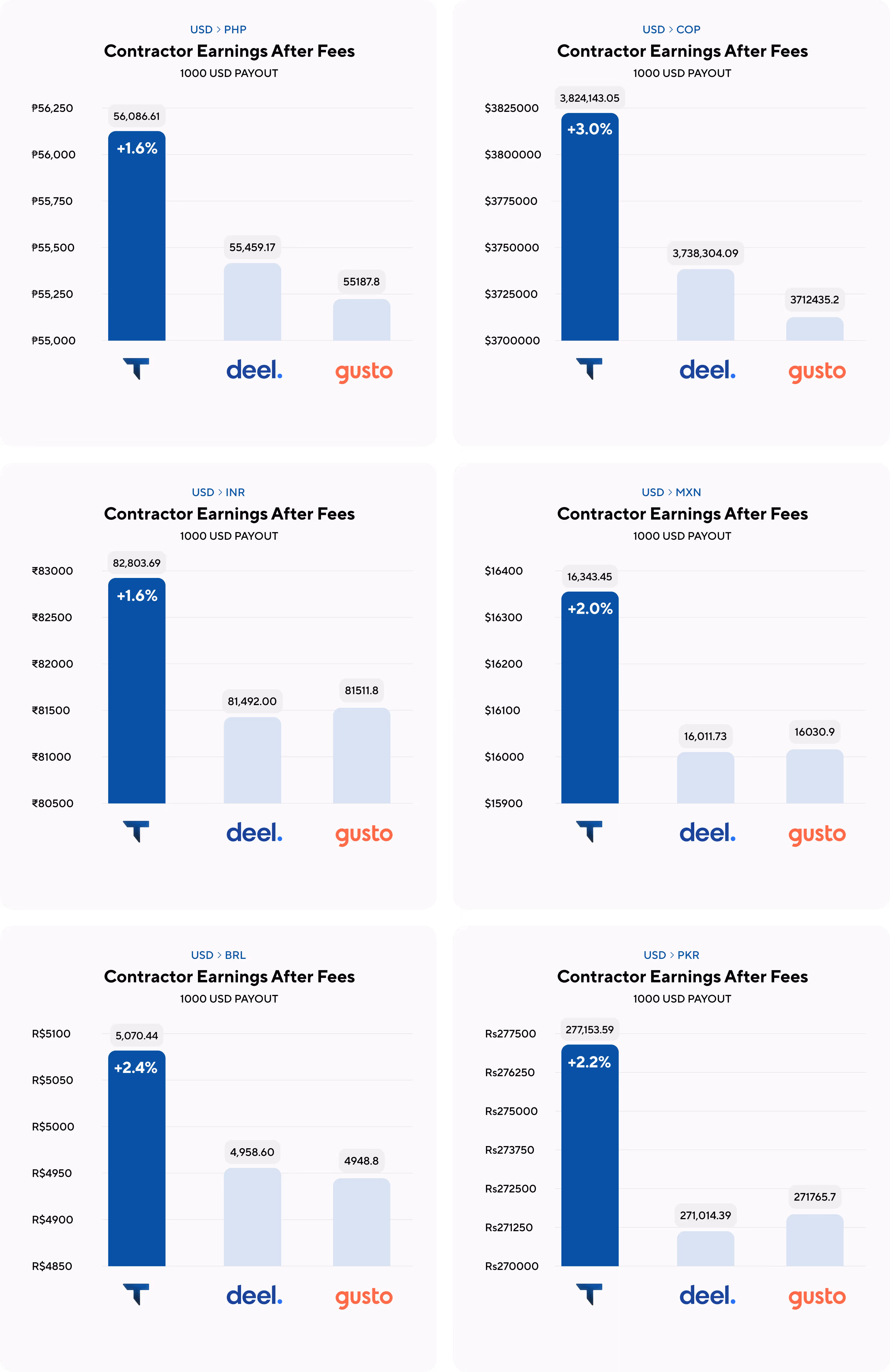 The results speak for themselves. Across five sample currencies, Thera significantly outperformed Gusto and Deel, with contractors receiving 1.6% - 3% more in their bank accounts compared to other providers.