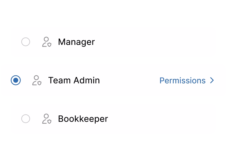 Set permissions for admins, managers, and bookkeepers. Everyone sees exactly what they need, nothing more.